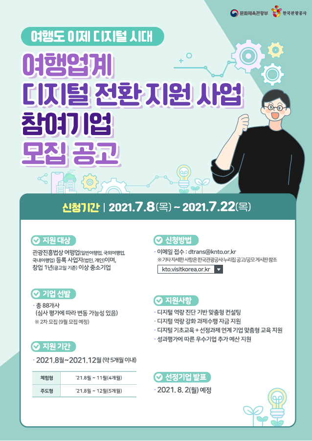 문화체육관광부(이하 문체부)는 한국관광공사(이하 관광공사)와 함께 8일부터 22일까지, 디지털 전환 지원 사업에 참여할 여행사를 모집한다고 밝혔다.