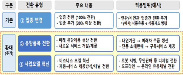 우선 신사업 진출 활성화를 위한 사업전환제도를 개편한다. 사업전환 적용 범위를 업종 전환에 한정하지 않고, 같은 업종에서의 유망품목 전환, 사업모델 혁신 등 신사업 진출까지 확대한다.