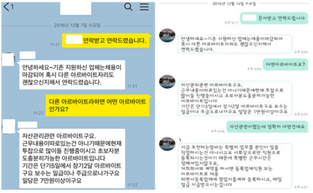 2016년 금융감독원에 접수된 대포통장 신고내역을 분석한 결과, 사기범들은 주로 문자메시지, 구직사이트 및 SNS(페이스북 등)를 이용해 대포통장을 모집하고 있는 것으로 나타났다. 이중 문자메시지를 이용한 건수가 579건으로 전체의 73%를 차지하고 있었으며 전년 대비해서도 283%나 증가했다. ‘17년 1분기 들어서도 문자메시지를 이용한 건수가 전년 동기 대비 469% 증가하는 등 급증하는 추세이다.