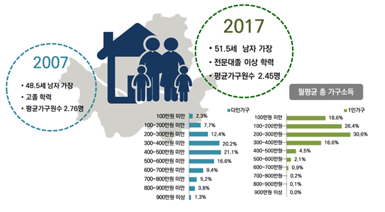 이번 조사에 따르면 2017년 기준 서울의 가구주 평균나이는 51.5세로 10년 전인 2007년의 48.5세보다 3세 늘어났으며, 가구원수는 2.45명으로 2007년 2.76명 보다 줄어든 것으로 나타났다.