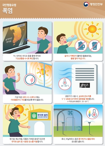 행정안전부는 지자체와 함께 무더위쉼터 관리를 강화하고, 논·밭, 비닐하우스 등에 대한 마을·거리 방송 실시, 그늘막 등 폭염 저감시설 설치 확대 및 행동요령 홍보를 집중적으로 추진할 예정이다.