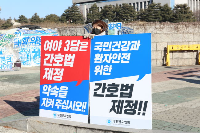 간호법 제정 촉구 집회에 참석한 관계자가 여야 3당에 간호법 제정 약속을 지키라는 내용의 피켓을 들고 있다. 12일 국회 앞에서 간호대학생들이 참여한 간호법 제정 촉구 수요 집회가 열렸다. 간호대학생들은 이날 신경림 대한간호협회 회장과 함께 간호법 제정 촉구 퍼포먼스를 진행했다.