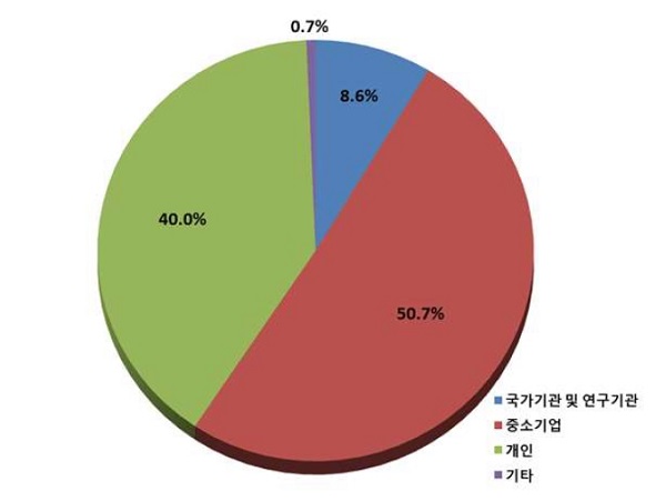 10년간 열섬현상 저감 도로 포장 출원건수 총 440건을 출원인별로 나누어 살펴보면, 중소기업과 개인의 출원이 각각 50.7%와 40.0%로 나타나 중소기업과 개인의 출원이 활발함을 알 수 있다. 이에 반해 정부, 연구소, 대학과 같은 국가 기관 및 연구 기관에서의 출원은 8.6%로 비교적 낮게 나타났다.