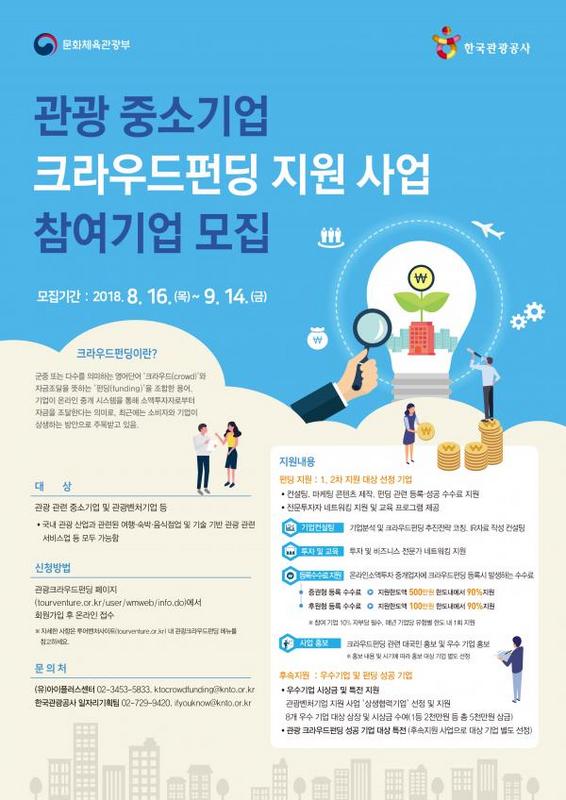 문화체육관광부와 한국관광공사는 오는 16일부터 9월14일까지 ‘2018 관광 중소기업 크라우드펀딩 지원 사업’ 참가 기업 2차 공모를 실시한다.