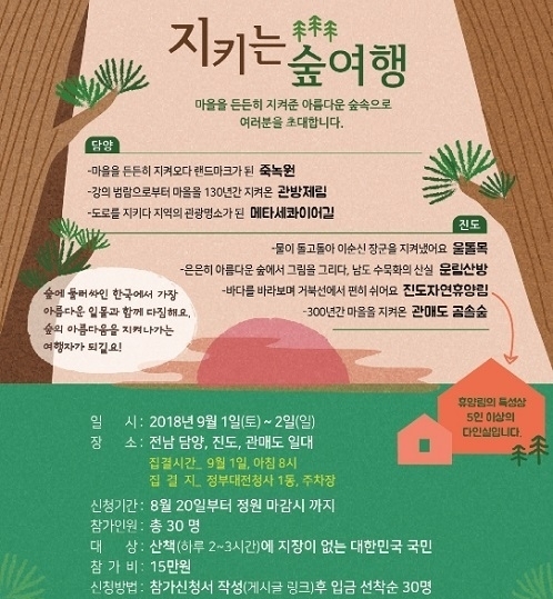 산림청은 오는 9월 1일부터 2일까지 1박 2일간 마을을 든든히 지켜온 아름다운 숲속을 걷고, 보고, 듣고, 체험하며 숲의 가치를 느끼는 '지키는 숲여행'을 진행한다고 20일 밝혔다.