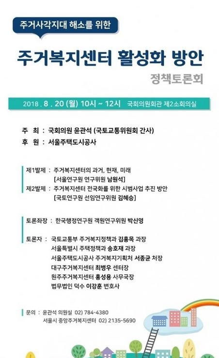 서울주택도시공사는 국회 국토교통위원회 윤관석 의원실과 함께 20일 10시부터 국회의원회관 제2소회의실에서 ‘주거사각지대 해소를 위한 주거복지센터 활성화 방안 정책토론회’를 개최한다고 밝혔다.