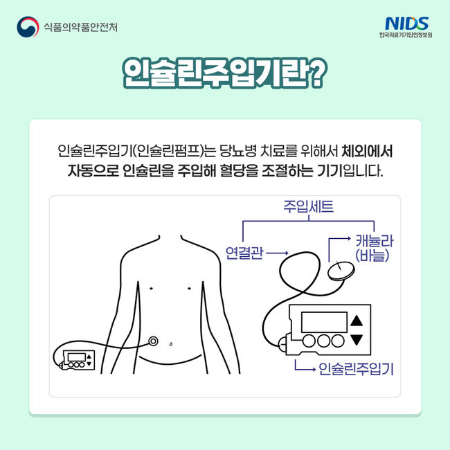 식품의약품안전처는 체외용인슐린주입기(이하 인슐린주입기)를 안전하게 사용하는 데 도움을 주기 위해 사용 전 준비사항과 사용 시 주의사항 등을 안내한다고 밝혔다.