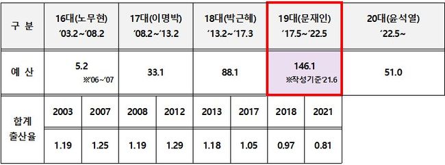 그러면서 서 의원은 “19대 문재인 정부가 5년 동안 146조가 넘는 어마어마한 예산을 저출산 극복을 위해 쏟아부었음에도 합계출산율 수치는 급격하게 떨어졌다”고 지적하며 “밑빠진 독에 물 붓듯 나랏돈을 펑펑 써댄 결과는 인구감소에 따른 국가의 경제 시스템 붕괴 위험”이라고 진단했다.