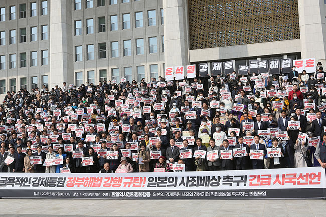 이들은 "윤석열 정부는 대한민국의 국격을 땅에 떨어뜨리고, 국민의 아픔을 다시 짓밟으며, ‘식민지배는 불법’이라는 우리 헌법의 근본 질서를 스스로 훼손했다"며 "대법원 판결을 무력화하면서까지 가해자에 머리 조아리며 면죄부를 줬다"고 반발했다.