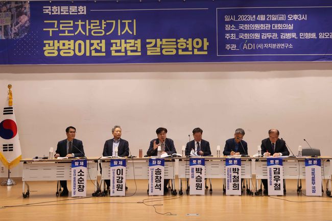 발제는 소순창 건국대 교수와 이강원 한국사회갈등해소센터장이 맡았으며, 토론자로는 박승원 광명시장과 김우철 국회정책연구위원, 박철희 구로차량기지 광명 이전 반대 공대위 집행위원장 등 4명이 나섰다.