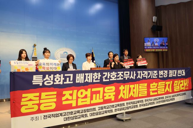 전국직업계고 간호교육교장협의회, 고등학교간호교육협회, 한국직업교육학회 등 관계자들이 24일 국회 소통관에서 ‘특성화고 위기 몰고 올 정부 여당의 간호법 중재안 반대’ 기자회견에서 “지난 4월 11일 국민의힘 정책위 박대출 위원장은 ‘간소조무사 학력 요건은 특성화고 간호 관련학과 졸업 이상으로 차등을 두도록 했다’라는 내용이 포함된 간호법 당·정 중재안을 발표했다”고 밝혔다.