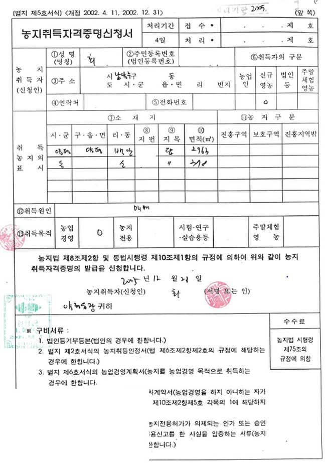 그러나 최씨가 직접 농사를 지었을 가능성은 낮아 보인다. 취득 당시 최씨가 작성한 농지취득자격증명신청서를 보면, 1000평이 넘는 땅을 혼자서(자기노동력으로) 경작하겠다고 신고한데다 농업기계·장비도 보유하고 있지 않다고 기재해 자경 의지가 있다고 보기 어렵다는 평가가 많다.