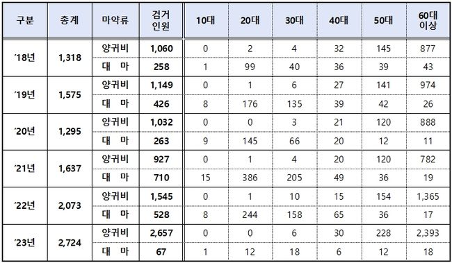 구체적으로 보면, 60대 이상의 양귀비 밀경작이 큰 폭의 증가세를 나타냈다. 60대 이상 양귀비 밀경사범은 2018년 877명에서 지난해 1365명으로 증가한 이후, 올해 2393명까지 급증했다. 같은 시기 50대 양귀비 밀경사범도 145명에서 228명으로 늘어나는 추세다.