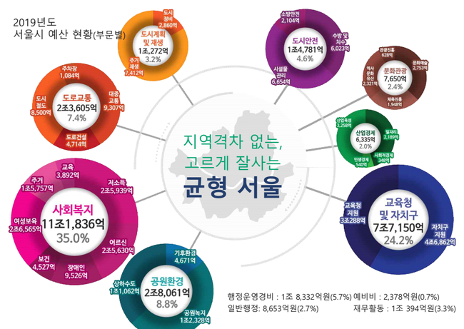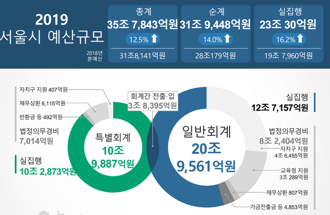 이와 함께 ‘2019년도 주목할만한 예산’으로 △청년 미래투자기금 지원 △서울사회서비스원 개원△생물다양성 지도제작 △지갑 없는 주차장 조성 △공공시설 비상용 생리대 비치△유기동물 동물보험 지원 등 의미있는 예산도 투입된다.