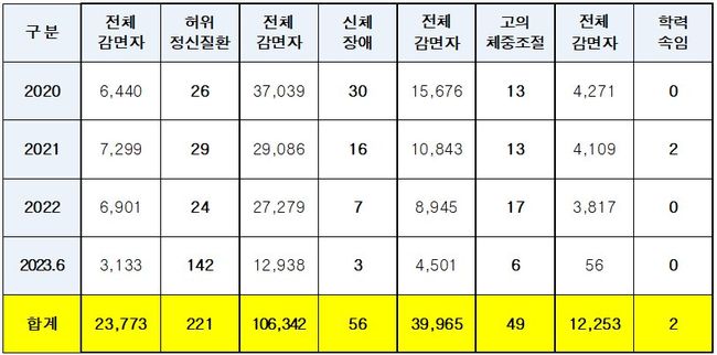 허위정신질환 위장 병역면탈은 2020년 26명, 2021년 29명, 2022명 24명에서 올해는 6월까지 작년보다 4배 이상 증가한 142명이 적발됐다. 이중 검찰과 병무청이 실시한 합동 수사로 적발된 뇌전증 사유 병역면탈자만 130명이었다.