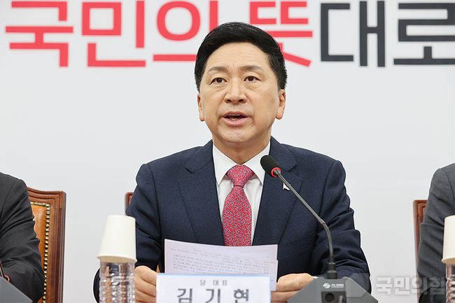 김기현 국민의힘 대표가 23일 오전 서울 여의도 국회에서 열린 최고위원회의에서 발언을 하고 있다. [[image1]]