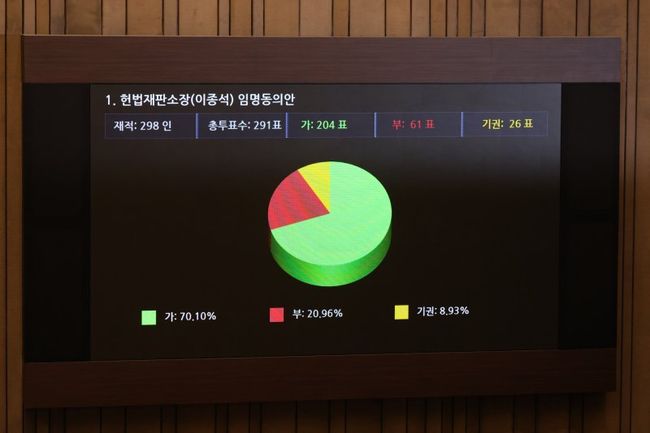 무기명 표결로 이뤄진 임명동의안은 총투표수 291표 중 찬성 204표, 반대 61표, 기권 26표로 가결됐다.