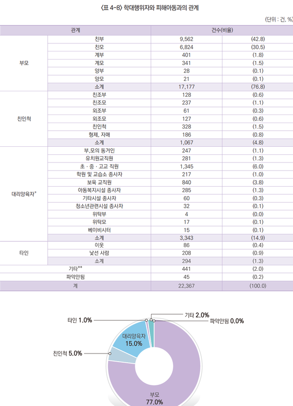 아동학대의 대부분은 예년과 마찬가지로 부모 1만7177건(76.8%)에 의해 가장 많이 발생했다.