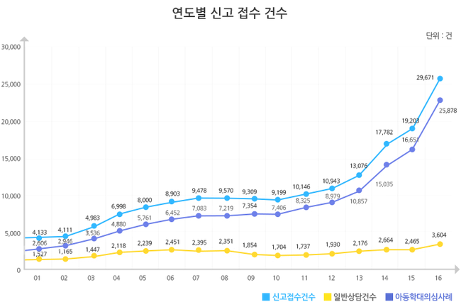 이 날 발간한 ‘2017 아동학대현황보고서(이하 현황보고서)’에 따르면 2017년 한 해 동안의 아동학대 신고는 총 3만4169건으로 작년대비 15.1% 증가하였다. 2016년 들어 54%에 육박했던 신고 건수의 증가세가 2017년 들어 둔화된 것이다.