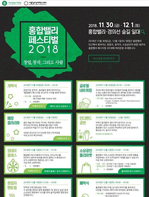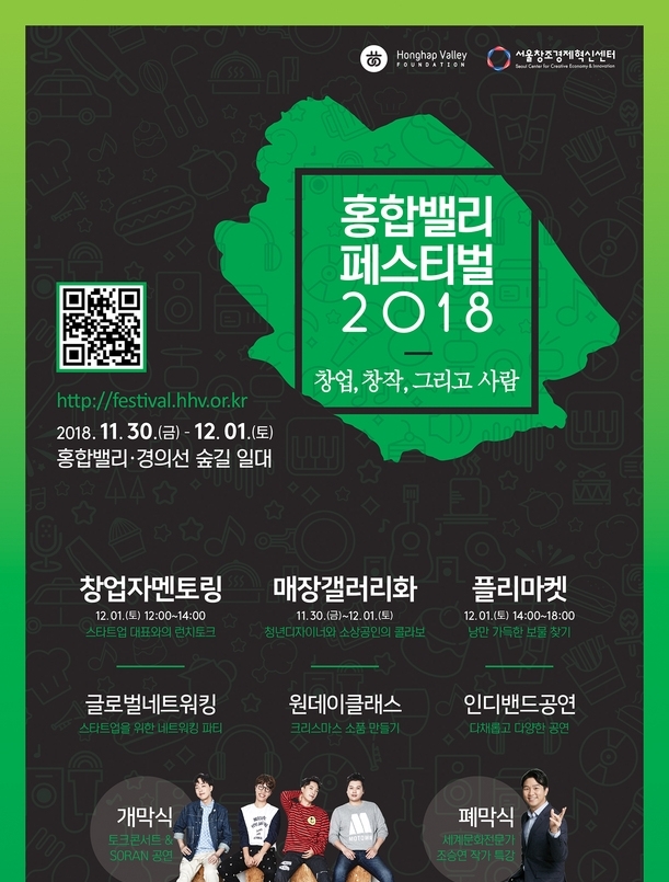 홍대·합정 지역 중심의 창업가·소상공인·예술가 위한 페스티벌 열린다. 재단법인 서울창조경제혁신센터와 재단법인 홍합밸리가 함께 진행하는 이번 ‘홍합밸리 페스티벌 2018’은 젊은이들의 핫플레이스로 각광받고 있는 홍대·합정 지역의 창업가와 예술가, 소상공인이 함께 소통하고 협업할 수 있는 기회의 장을 마련하기 위해 기획되었다.