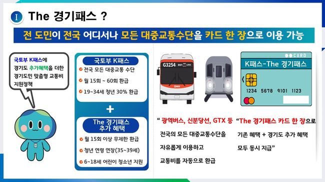 한편 경기도는 The 경기패스 이용 활성화를 위해 BI(Brand Identity)와 슬로건을 확정했다. BI는 The 경기패스의 The와 플러스(+)를 형상화하면서 직장인, 학생, 어린이 등 모든 도민의 일상에 더 많은 플러스(+)가 되겠다는 의미를 담았다. 슬로건은 ‘대한민국 모든 길에 통한다. The 경기패스’로, 전국 모든 대중교통 할인 혜택을 강조했다.