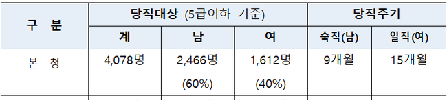 당직 인원은 남녀 혼합방식으로 구성하고 당직 업무는 남녀 구분 없으나, 사업소 등 사정에 따라 남녀 구분하여 인원 구성할 수 있고 업무 특성에 따라 현장 업무 등 불가피한 경우에 한해 남성공무원으로 분장하도록 하였다.