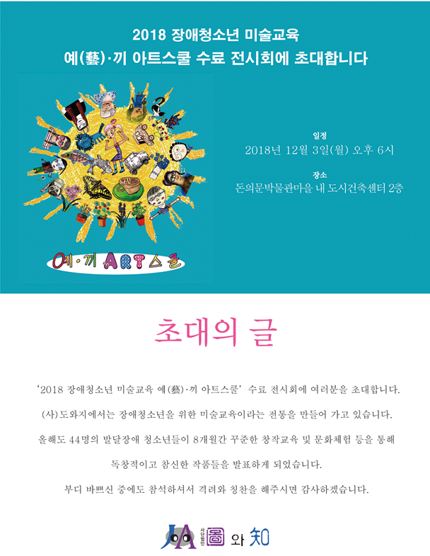 서울시와 장애청소년 미술교육 사업 주관처 도와지(圖와知)는 12월 3일(월)~8일(토) 6일간, 돈의문박물관마을 내 도시건축센터 2층에서 <2018 장애청소년 미술교육> ‘예(藝)·끼 아트스쿨’ 전시회를 개최한다.