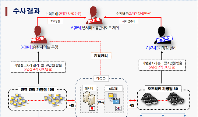 그 중 해외 웹서버 및 음란사이트 제작자, 음란사이트 운영자 등 2명을 구속 송치(11. 21.)하고, 가맹점 관리 및 음란물 하드디스크 업데이트 담당자, 가맹점을 운영하는 업주 등 5명은 불구속 송치하였다.