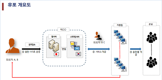 피의자 A는 ’15년 초순경 일본에 “티○○”라는 제목으로 웹서버 구축, ’16. 1월경 국내에 스트리밍서버 제작한 후 B에게 5,000만 원에 판매하고, B는 스트리밍서버에 음란동영상 24,823개, 불법촬영물 1,693개를 업로드하여(6.6TB) D, E, F, G 등 전국 136개 가맹점(성인 PC방) 업주들에게 공급해주고 매월 20만 원씩 제공받았다.
