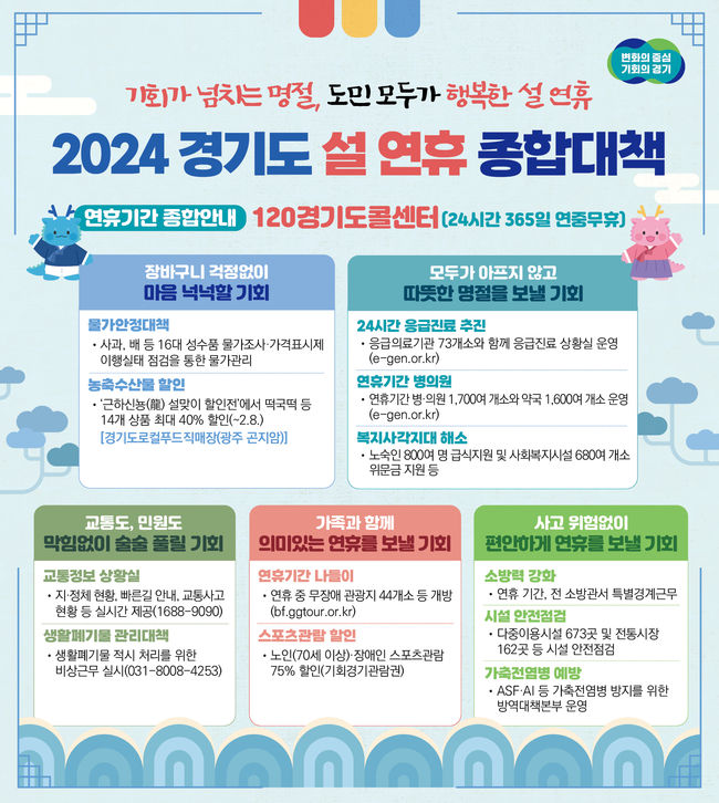 경기도가 ‘기회가 넘치는 명절, 도민 모두가 행복한 설 연휴’를 위해 총 5개 분야 24개 대책을 중점으로 ‘설 연휴 종합대책’을 추진한다. 연휴 기간 불편 사항이 있을 경우, 경기도 콜센터(031-120)로 전화하면 도움을 받을 수 있다.