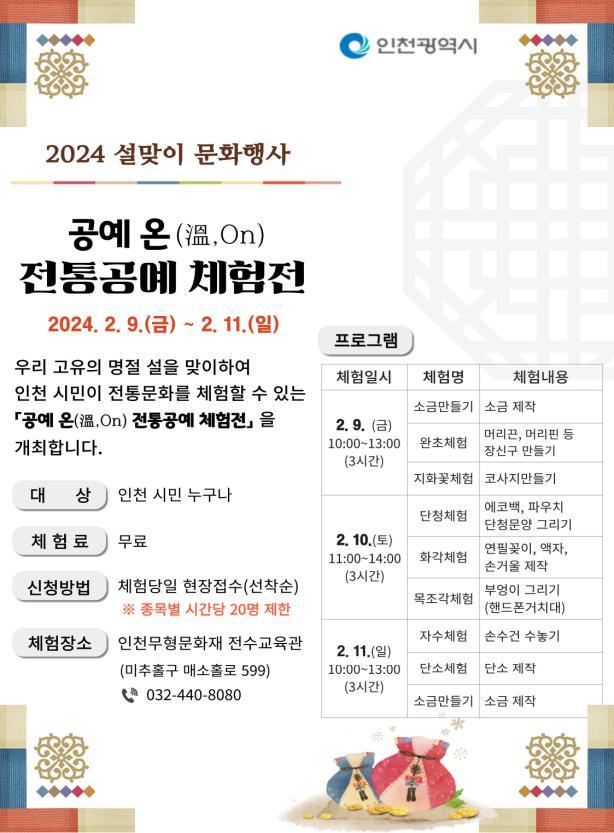 인천광역시는 설 명절을 맞이해 2월 9일(금)부터 2월 11일(일)까지 인천무형문화재 전수교육관에서 우리 전통문화를 체험할 수 있는‘공예 온(溫, On), 전통공예 체험전’을 개최한다고 밝혔다.