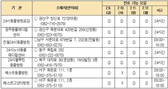 광주광역시는 설 연휴기간인 9일부터 12일까지 7개소(동구 1, 서구 2, 남구 1, 북구 1, 광산구 2개소)의 응급 동물병원을 운영한다.