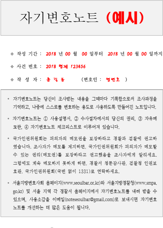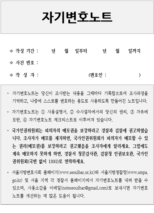 '자기변호노트'란 피의자가 자신의 진술 및 조사 주요사항을 스스로 기록하고 수사과정에서의 인권침해 여부를 점검할 수 있도록 서울지방변호사회에서 제작한 20쪽 분량의 노트이다. △사용설명서 △피의자의 권리 △메모장 △체크리스트 등 총 4개 장으로 구성되어 있다.