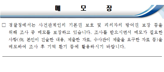 누구나 한 번쯤은 경찰서에 나가 조사를 받아야 하는 경우가 발생할 수 있다. 일어나지 않아야겠지만 나와 내 가족이 범죄 피해를 입을 수도 있고, 의도치 않게 사건ㆍ사고에 연루될 수도 있다. 낯선 분위기에서 경험한 사실관계를 진술하는 상황만으로도 긴장감과 불안감이 생길 수밖에 없어, 많은 사람들이 조사를 받고 나온 후 자신이 말한 내용조차 기억이 잘 나지 않는다고 토로한다. 이에, 경찰청은 사건관계인(피의자ㆍ피해자ㆍ참고인 등)의 기본권과 방어권을 한층 더 높이기 위해 이들의 메모권을 실질적이고 전면적으로 보장하는 방안을 마련해 시행한다고 밝혔다.
