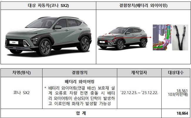 현대 코나 SX2 18,664대는 배터리 와이어링(연결 배선) 보호재의 설계 오류로 2월15일부터, 넥쏘 246대는 전기적 신호로부터 가스를 방출시켜 에어백을 부풀게 하는 커튼에어백 인플레이터의 제조 불량으로 2월14일부터 시정조치에 들어간다.