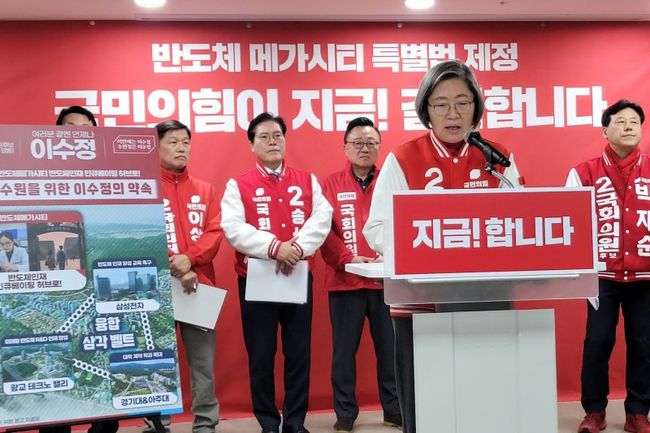 국민의힘 수원정 이수정 후보가 18일 경기남부권역 국민의힘 후보들과 함께한 반도체공약 합동발표에서 수원 영통을 반도체인재인큐베이팅 허브로 조성하겠다는 공약을 발표했다.