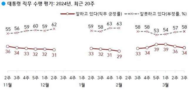 한국갤럽이 2024년 3월 셋째 주(19~21일) 전국 만 18세 이상 유권자 1,001명에게 윤석열 대통령이 현재 대통령으로서의 직무를 잘 수행하고 있다고 보는지 잘못 수행하고 있다고 보는지 물은 결과, 34%가 긍정 평가했고 88%는 부정 평가했다. 그 외는 의견을 유보했다(어느 쪽도 아님 2%, 모름/응답거절 5%).