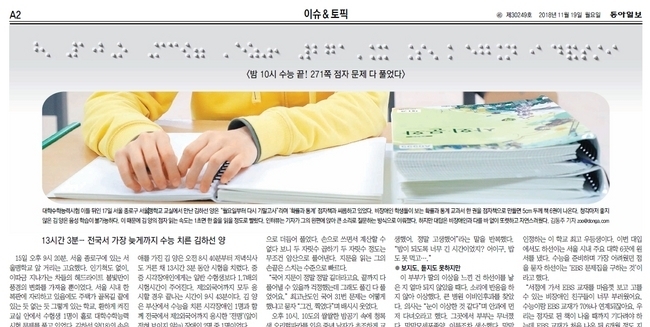 장애인먼저실천운동본부가 11월 이 달의 좋은 기사로 동아일보 임우선 기자의 <밤 10시 수능 끝! 271쪽 점자 문제 다 풀었다>를 선정했다. 11월 ‘이 달의 좋은 기사’로 선정된 동아일보 <밤 10시 수능 끝! 271쪽 점자 문제 다 풀었다>는 2018년도 수능시험을 치른 ‘김하선’ 양의 사례를 통해 시각장애 학생이 어떻게 공부하고 시험을 보는지 등의 교육 현실을 보도하고 있다. 이정연(KBS라디오 PD) 위원은 “시각장애인의 학습권, 시각장애 자녀의 학습을 위한 부모의 희생, 나아가 넓은 의미인 장애인식개선까지도 생각하게 하는 기사”라고 평가했다.