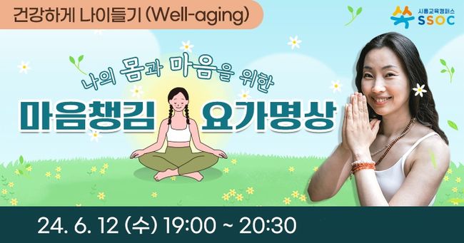 6월엔 건강하게 나이들기(Well-aging) 테마에 맞춰 몸과 마음을 위한 요가명상, 전신 순환을 위한 아로마 오일 만들기 강의를 운영한다. 포털사이트에서 ‘시흥교육캠퍼스 쏙’을 검색하거나 모바일 앱 스토어에서 ‘시흥교육 쏙’ 검색‧설치 후 ‘화상학습’ 메뉴에서 신청할 수 있다.