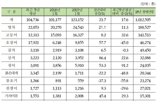 해양수산부는 2019년 1월 연근해어업 생산량이 지난해 1월에 비해 22% 증가했다고 밝혔다.