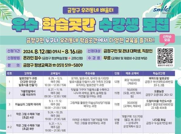 부산시 금정구는 우리 동네 배움터인 `학습곳간` 중 상반기 교육 운영 성과가 우수한 11개소를 우수 학습곳간으로 지정해 8월 12일부터 수강생을 모집한다.