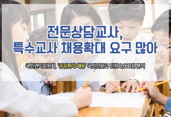 지난해 공공분야 채용과정에서 학교생활에 어려움을 겪는 학생을 상담하는 전문상담교사와 장애학생의 교육을 담당하는 특수교사의 채용 확대를 요구하는 민원이 가장 많았던 것으로 나타났다.