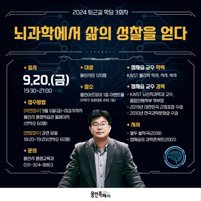 용인특례시는 다음 달 20일 열리는 ‘2024년 제3회 퇴근길학당’의 강사로 정재승 KAIST 뇌인지과학과 교수를 초청했다고 28일 밝혔다.