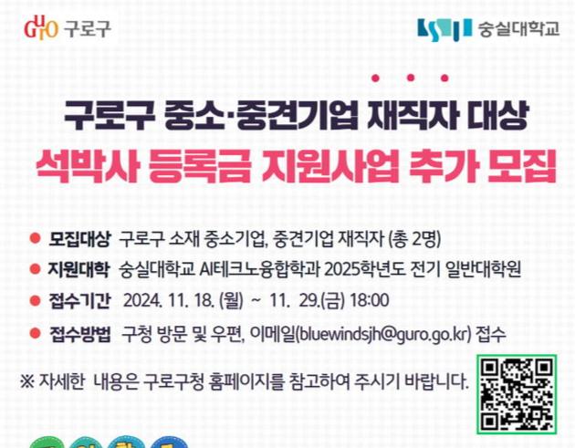 구로구가 지역지능화혁신인재양성사업의 일환으로 숭실대 AI테크노융합학과 석·박사 과정 장학생을 추가 모집한다.