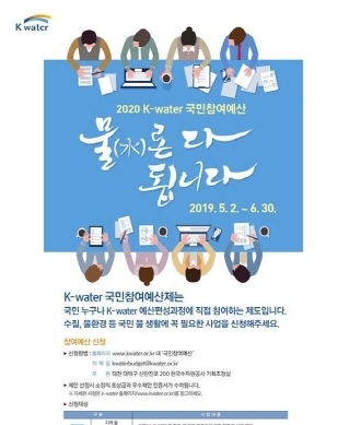 환경부 산하 한국수자원공사는 정부혁신 과제인 '참여를 통한 문제해결'을 선도하기 위해 국민이 직접 물 관련 사업제안과 예산 편성 과정에 참여하는 '국민참여예산제'를 시행한다.