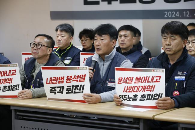민주노총은 4일 기자회견을 열고 윤석열 대통령의 비상계엄 선포를 "반민주적, 반헌법적 폭거"로 규정하며 무기한 총파업에 돌입한다고 밝혔다. 민주노총은 국민과 함께 윤 대통령 퇴진을 위한 투쟁에 나설 것이라고 선언했다.