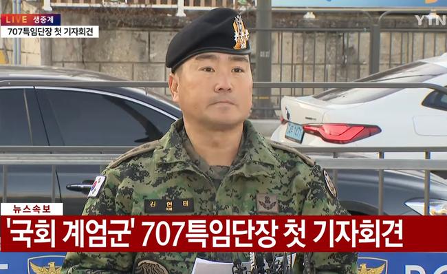 707특수임무단 김현태 단장이 12월 9일 오전 8시 30분 용산에서 기자회견을 열고, 최근 국회의사당 난입 작전과 관련된 모든 지시는 자신이 내렸다고 밝히며, "부대원들은 잘못이 없는 피해자"라고 강조했다.