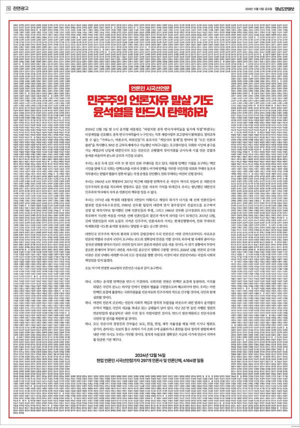 윤석열 대통령의 탄핵 표결을 앞둔 14일, 전국에서 4천164명의 언론인이 탄핵안 가결을 촉구하는 시국선언을 발표했다.