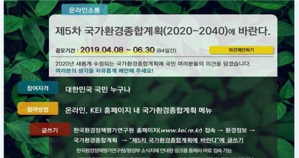 먼저 최대한 많은 국민 목소리를 담아내기 위해 한국환경정책평가연구원 누리집에 6월 30일까지 누구나 자유롭게 의견을 개진할 수 있는 온라인 소통방을 개설했다.