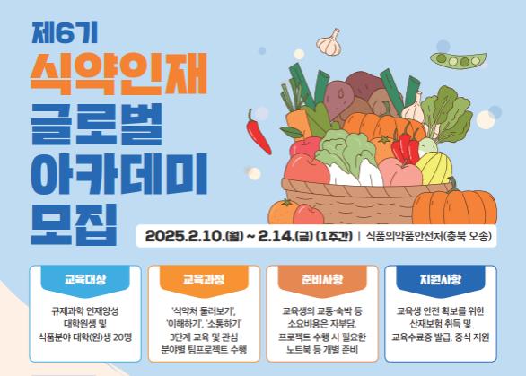 식품의약품안전처는 식품 분야 대학생 및 규제과학 대학원생을 대상으로 식약처의 정책과 연구를 체험할 수 있는 ‘제6기 식약인재 글로벌 아카데미’ 참가자를 1월 6일부터 17일까지 모집한다고 밝혔다.